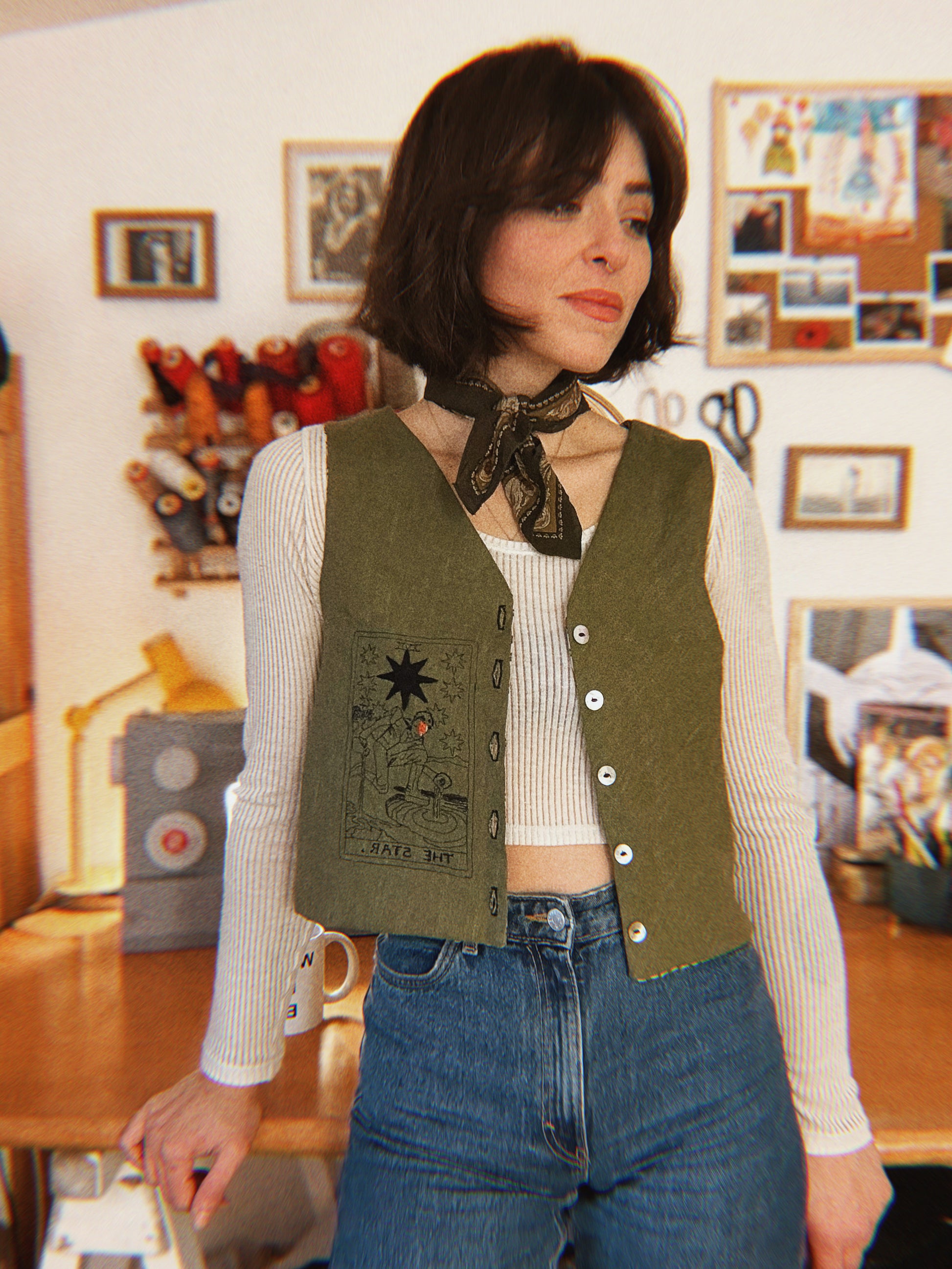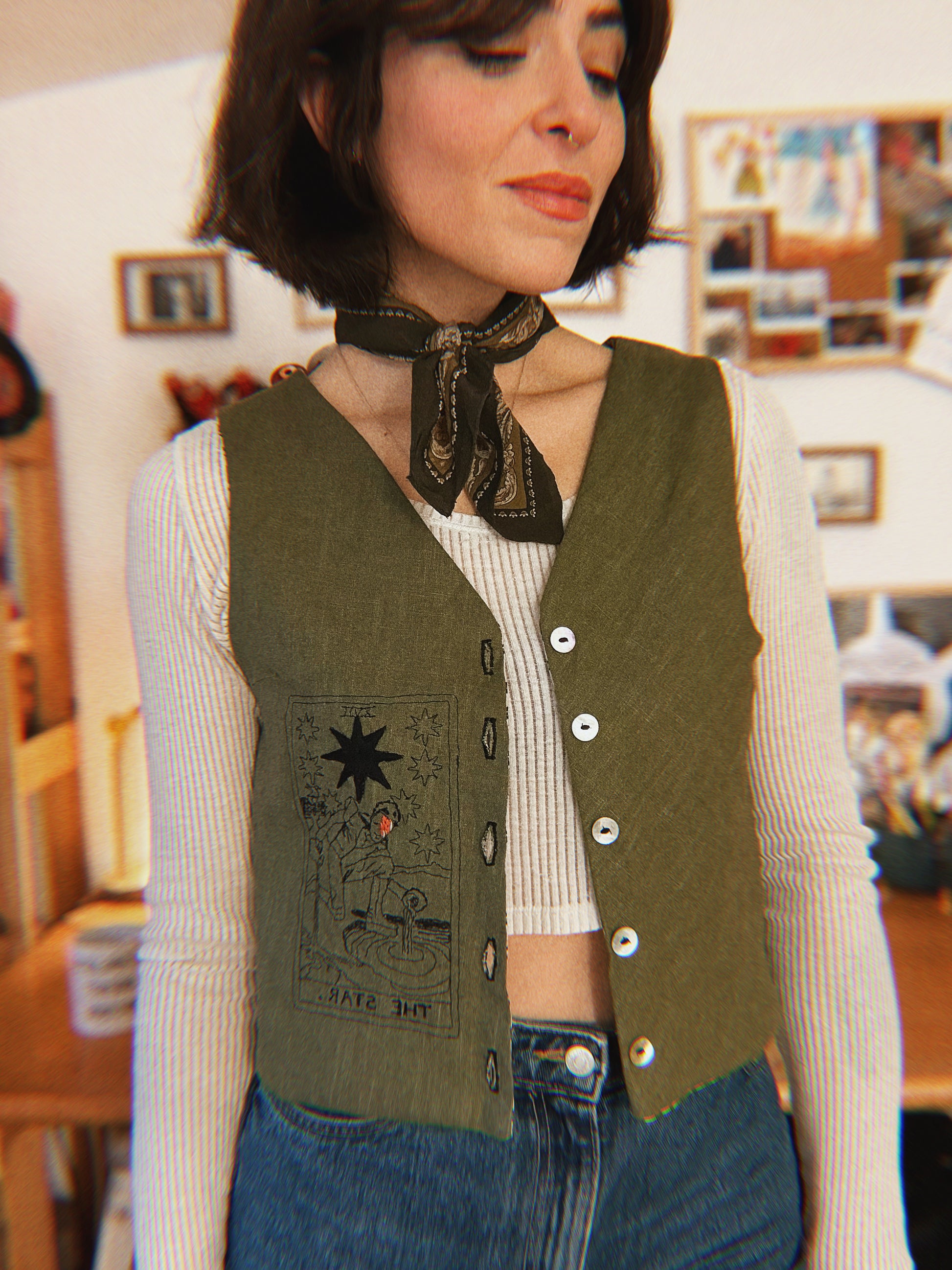 David Bowie ✨ Embroidered Linen and natural block printed cotton vest size S/M