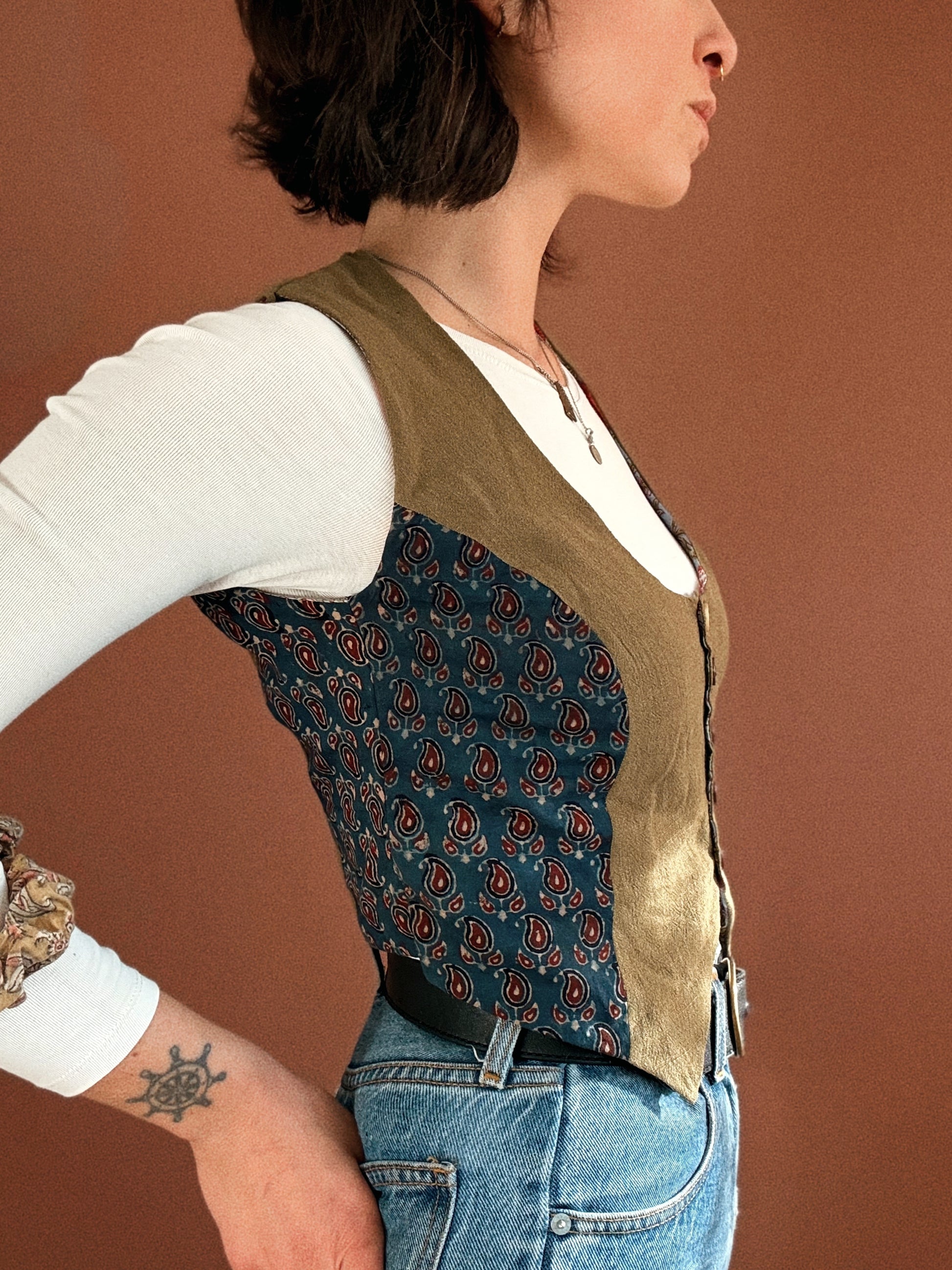 George vest ~ Stencil printed cotton and natural block printed cotton vest size S/M
